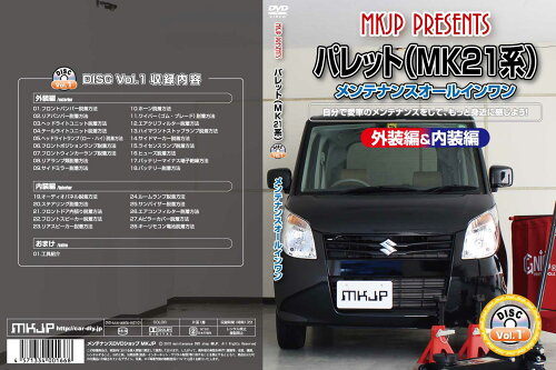 このDVDがあれば、自分でドレスアップして工賃節約!もっとエコライフになります! パレット MK21系 初心者のあなたもDIYで格安チューニング!ドレスアップや改造車にして楽しいクルマライフを送りましょう!! おまけ映像特典として、DIYに欠かせない工具のマメ知識 「 工具紹介 」 を収録! パレット MK21系 メンテナンスDVD 外装関連 フロントバンパー脱着方法 リアバンパー脱着方法 ヘッドライトユニット脱着方法 テールライトユニット脱着方法 ヘッドライトランプ(ロー・ハイ)脱着方法 フロントポジションランプ脱着方法 フロントウィンカーランプ脱着方法 リアランプ類脱着方法 サイドミラー脱着方法 ホーン脱着方法 ワイパー(ゴム・ブレード)脱着方法 エアクリフィルター脱着方法 ハイマウントストップランプ脱着方法 サイドマーカー脱着方法 ライセンスランプ脱着方法 ヒューズ脱着方法 バッテリーマイナス端子絶縁方法 バッテリー脱着方法 内装関連 オーディオパネル脱着方法 ステアリング脱着方法 フロントドア内張り脱着方法 フロントスピーカー脱着方法 リアスピーカー脱着方法 ルームランプ脱着方法 サンバイザー脱着方法 エアコンフィルター脱着方法 Aピラーカバー脱着方法 キーリモコン電池脱着方法 おまけ 特典 工具紹介(格安工具や必須工具の紹介・解説)